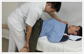 Eその後仰向けにて下肢部、お尻、腰部に対してストレッチを加え、骨盤・腰椎の位置を正常に戻す為矯正をかけ、正しい位置に戻します。最後に痛みによって起こされた、運動記憶障害の除去の為軽運動を行います。この治療法により腰部の改善はもとより全身循環の改善から指先の痺れや冷え症、便秘の改善がうかがえます。