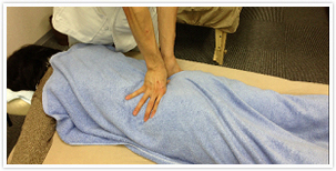 治療法:一番の原因に腰部そして、周囲の筋の硬結が目立ち、筋の圧迫により、馬尾神経や血液供給が阻害され、立ったり、歩いた際にうまく機能せず痛みやしびれを出してしまいます。まず腰部、腰部の周囲の筋そして腰部に負担をかける背部の筋に筋緩和薬を塗り込み、筋を解していきます。下肢部からの負担の除去のため腰部より下肢部に手技療法を加え、温罨法をつかい、筋を動きやすい状態にしていきます。運動療法を用いて関節可動域を増やし、神経の圧迫を除去します。充分筋を緩めた後は脊椎を牽引し十分に関節に遊びをつくりズレの矯正をかけ、背骨を人間本来の位置に整復します。